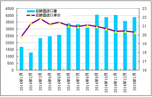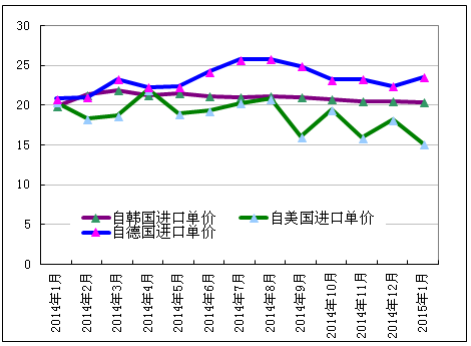 2015年1月份从韩国进口多晶硅量增加至3867吨,环比增幅为7.7%;1月份进口单价微幅下降至20.31美元/千克,环比降幅为0.78%。