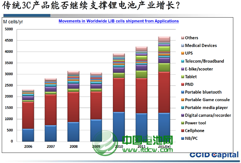 传统的3C小锂电池已经呈现技术成熟、品牌集中态势,手机、数码相机、IPAD、电动工具等数码、工具类终端产品市场增长继续呈现稳步增长趋势,但明显放缓。