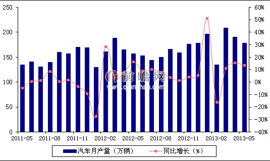 2011年5月-2013年5月我国汽车产量及同比增速(单位:万辆,%)