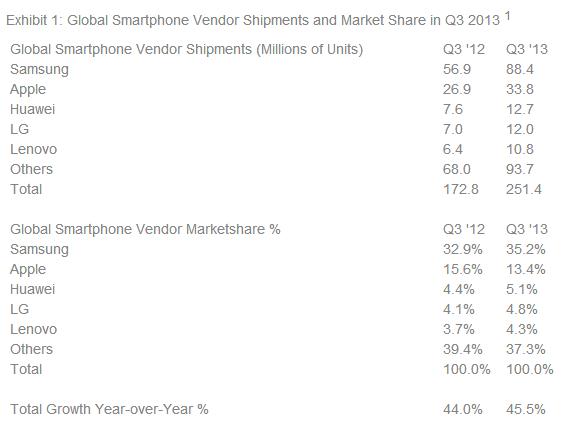三星第三季智能机出货量达到8840万台,市场份额从去年同期的32.9%增长至35%;