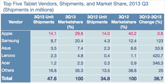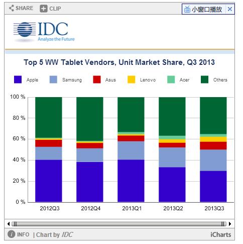 根据IDC公司最新公布的数据显示苹果在今年第三季度共计发售1410万台iPad,相比较第二季度环比下降50万台。而苹果的最大竞争对手三星的Android设备在本季度的出货量为970万台,位居第二。