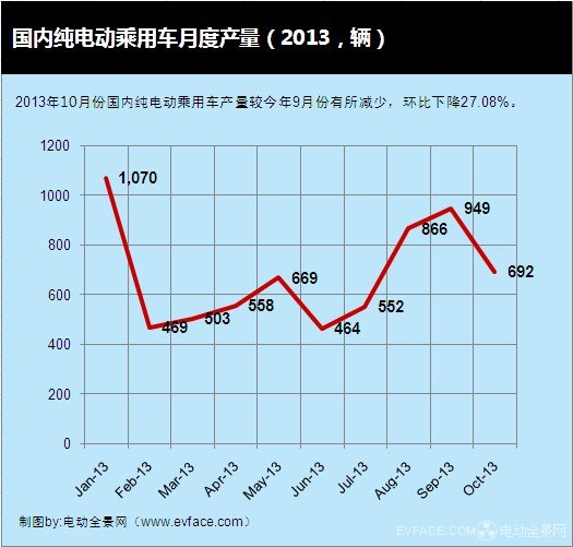 2013年10月份国内纯电动乘用车产量692辆,较今年9月份产量有所减少,环比下降27.08%,与去年10月份相比,同比下降40.41%。