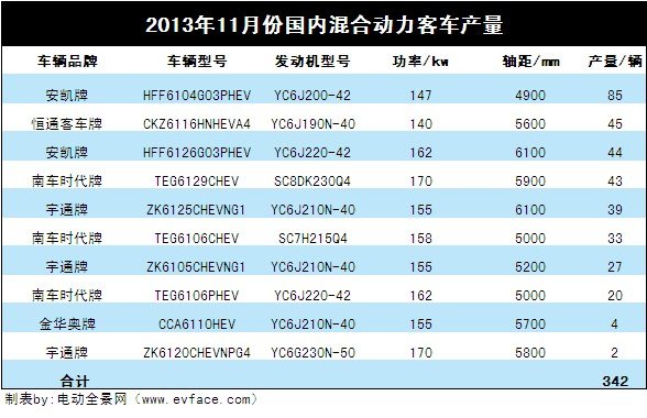 11月我国国内混合动力客车产量342辆,其中油电混合动力客车225辆,气电(非插电)混合动力客车70辆,插电式(气电)混合动力客车47辆。由于对传统混合动力客车的补贴暂未出台,而且相较插电式