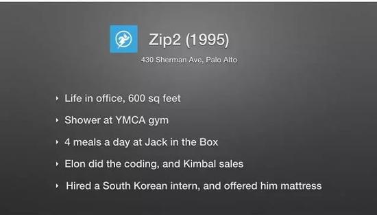 Musk 从默默无闻到声名鹊起,是从和他一起来到美国的兄弟 Kimbal 合作开始的。他们一起开了第一家网络公司 Zip2,一个帮助传统媒体把内容和信息发布到互联网上的平台,其中包含黄页和白页功能,目标是帮助全国性的网络媒体与地方商家合作,将产品地方化。因为预算很紧,Musk 和 Kimbal 及另一位朋友合租了一套公寓,就在公寓里办公和睡觉,需要洗澡就去教会。作为首席程序员,Musk 不分昼夜地坐在电脑前工作。