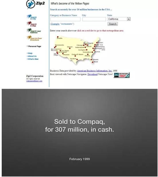 1999 年,康柏以 3.07 亿美元收购了 ZIP2,也让当时年仅 27 岁的 Musk 赚到了2200万美金。