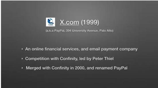 在 X.com 办公的同一栋楼里,还有另一家叫 Confinity 的互联网金融公司,创始人是如今大名鼎鼎的彼得·泰尔(Peter Thiel)和 Max Levchin。X.com 拥有快捷转账服务,后来 Confinity 也决定开发类似服务。两家公司都开始注意到快捷转账服务的市场需求很大,这也使两家公司之间的竞争愈发激烈,最终他们决定合并成一个公司,就是我们今天所熟知的 PayPal。