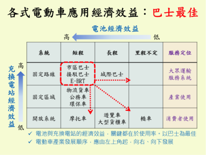 关键在于能源使用率。 你的电池充一次电后使用的单位成本,建一个充电站、或是换电站后,被使用的程度,都是重要的考量。
