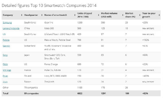 此外,据SmartWatch Group的统计显示,在过去的2014年,三星以年销售120万和3亿美元位居全球智能手表出货量和销售额的榜首。有意思的是,在排名前十的生产智能手表的厂商中,有5个也是智能手机厂商,其分别是三星、联想/摩托罗拉、LG、索尼、华硕。而相对于专注于智能手表的厂商,例如Pebble、Fitbit等,它们进入的时间并不长,但依然在智能手表市场占有了自己的一席之地,可见智能手机(例如品牌、销量等)对于智能手表具有相当的促进作用,而从这5家厂商出货量和排名看,其在智能手表市场的表现与其在智能手机市场中的表现也基本呈正比关系。即在智能手机市场排名靠前的厂商,智能手表的出货量相对较多,其ASP(均价)较高。例如三星智能手机的ASP在250美元;联想/摩托罗拉为250美元;LG的ASP为230美元;索尼为150美元,华硕为200美元。相比较,专门从事智能手表厂商的ASP多在150美元以下。例如知名的Pebble智能手表的ASP为130美元;Fitbit为120美元。即从事智能手机的厂商的智能手表的ASP要比专门从事智能手表的ASP要高出100美元左右。这从一个侧面反映出智能手表与智能手机在品牌、销量、应用上的关联性及对于销售的影响。