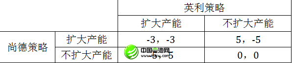 下面我们以尚德为一方,以英利作为众多中国太阳能企业代表绘制一张博弈表(payoff matrix)。如果双方都不扩大产能,各自的收益都是零。单方扩大产能,可以获得五方面的收益:成本优势、市场占有率、土地税收政策优惠、资本市场的追捧银行的追加信贷、品牌知名度。假设单方扩产方收益为5单位,则不扩产一方的损失为5单位。如果双方都扩大产能,必然造成原料涨价、产品降价和资金链紧张,各自的损失为3单位。施正荣与苗连生,象绝大多数企业家一们,本能地不会容忍竞争对手单方面扩大产能。从博弈论角度一点也没错:对方不扩大能产,已方扩大的收益为5,否则收益为零,当然要扩;对方扩大能产,己方按兵不动的损失为5,奋起直追的损失为3,还是要扩。也就是说,不管对采取什么样的策略,己方扩产都是“占优策略”。如果时光倒流,尚德依然不会让自己的产能止步于400兆瓦而坐视英利扩产到1600兆瓦!