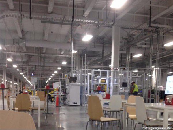 生产区广角镜头。能看到忙碌的工人,以及一些貌似用来休息的桌子和椅子。