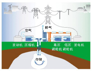 空气被泵入地下储藏室(耗尽的天然气井或盐穴),并且在那里被存储下来。直到需要时,空气经过加压从储藏室中释放出来,用来驱动发电机发电。