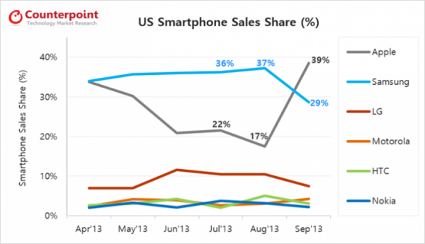 根据Counterpoint Research最新公布的数据,iPhone 5s的强劲市场需求量让苹果成功取代了三星,成为了美国9月份智能手机市场销量第一的手机。据悉,苹果9月销售份额达到了39%,三星曾下跌到了29%。