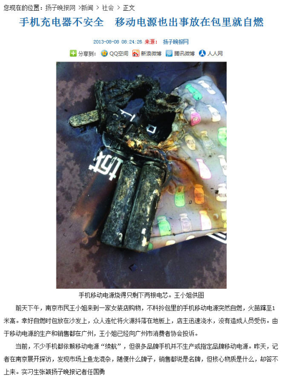 《扬子晚报》在8月6日报道:南京市民王小姐来到南京一家女装店内购物,她将拎包放在沙发上,坐在一旁歇息。突然,王小姐听到包内发出“噗嗤”一声响,随后拎包还抖了一下。打开一看,王小姐发现1个月前买的手机移动电源有些鼓胀,一摸还很烫手。那一刻,王小姐意识到移动电源可能会自燃,便用纸巾捏住电池准备拿出来。就在她取出移动电源的瞬间起火了。她迅速将电源抖落在地,但是火苗已经将拎包烧出一个大窟窿。王小姐心有余悸地告诉记者,当时电池蹿出的火苗最高约1米,喷溅到人身上肯定会被灼伤。当时服装店内烟雾弥漫,焦糊味刺鼻。电池外壳几乎烧光,留下两根电芯。再一看,沙发被熏黑了,地板留下一块电池形状的深深烙印。