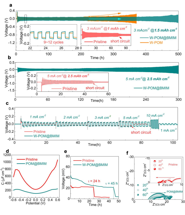在锂离子电镀过程中,表面带正电荷的添加剂易吸附在突起的电子集中分布的尖端上,靠近这些区域的锂离子受到一定程度的排斥,从而使锂离子在负极上的流动分布趋于均匀化。逐渐释放的具有非定域负电荷和丰富O官能团的无机POM核将收集从尖端排斥至周围的锂离子或在电解液中溶剂化的锂离子。在重复充放电过程中的电场力作用下,POM聚阴离子和反电荷离子之间的动态可逆和非锚定的静电相互作用使POM的释放具有可持续性。在捕获电子后,这些POM核将和被吸收的锂离子共组装,类似特殊的成核调节器,因此,Li离子流和Li金属沉积被进一步引导和均化。这一斥锂-富集协同机制促进LiF和LiNxOy组分在负极界面层(SEI)的富集,利于对锂枝晶的抑制作用。