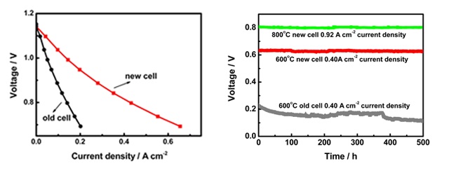 该团队研制出了LSM-YSZ微纳阴极电池,电池输出性能是传统LSM-YSZ阴极电池的2至3倍,并且在600oC至800oC下运行稳定。在LSM-YSZ微纳阴极中,纳米级LSM颗粒和YSZ颗粒的紧密接触增加了三相反应界面密度,大幅度地提高了阴极的氧还原活性。同时,纳米级LSM颗粒与纳米级YSZ颗粒的界面稳定提高了阴极在运行条件下的稳定性。