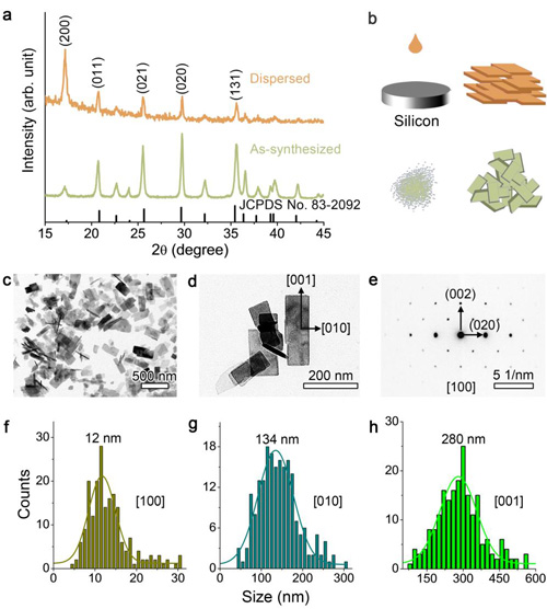 图1(a)新合成的样品和把样品分散后再滴到非晶硅上的XRD图谱。(b)图a的示意图。(c, d)LiFePO4的TEM图。(e)对应(d)的电子衍射花样。用高斯函数拟合LiFePO4晶粒沿着不同方向的尺寸统计数据。(f)a轴,12 nm,(g)b轴,134 nm,(h)c轴,280 nm。