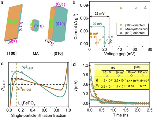 图2(a)[100]取向,微波辅助合成以及[010]取向LiFePO4的形貌示意图。(b)在不同的充放电电流下,从C/2到C/100,分别由[100]取向、微波辅助合成、[010]取向的LiFePO4构成的三种电极的电压间隙。(c)在LiFePO4中Li化学势相对于Li分数变化的函数关系,其中存在一个最大转变势垒(Δμb),定义为极大值和在不相混溶区中间的化学势之差。(d)[100]取向和微波辅助合成LiFePO4电极的恒电位间隙滴定及其拟合实验数据结果。