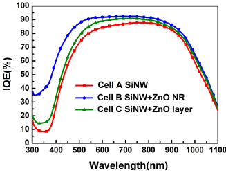嵌入ZnO纳米线的黑硅内量子效率对比