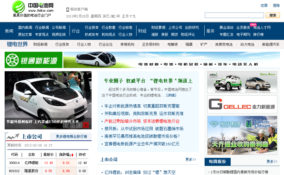 “锂电世界”下设“财经新闻”、“上市公司”、“行业报告”、“行业人物”、“行业论坛”、“券商机构”、“正负极材料”、“电解液”、“隔膜”、“矿产”、“消费类电池”、“动力电池”和“新能源汽车”等十几个子栏目,从新闻、行业等资讯和围绕锂电材料、产品及上下游产业链的不同角度去涵盖和解读“锂电”这一当下最热的投资领域和产品市场。中国电池网不仅仅提供专业、权威的行业资讯,还从财经投资的角度去关注电池行业的投资走向,去分析行业的市场走势,去观察从原料到材料到技术的先进制造动向。中国电池网不仅提供一些行业风云人物的创业历程,还从券商、投资机构的角度,去深挖上市公司的趋势动向和市场价值。