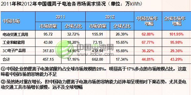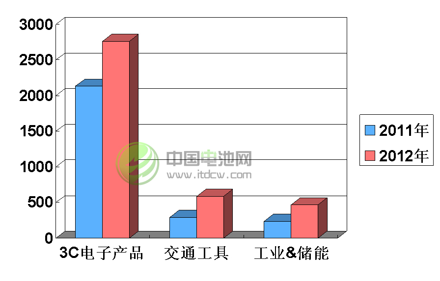 2012年全球动力锂离子电池市场增长总量527.12万kWh,虽然与3C小电池还有近100万kWh的差距,但增长速度(近100%)远高于小电池(不到30%);交通工具各细分市场呈现全面增长态势,工业&储能市场目前还主要依赖电动工具,但智能电网储能和移动基站电源市场增长很快。
