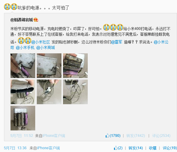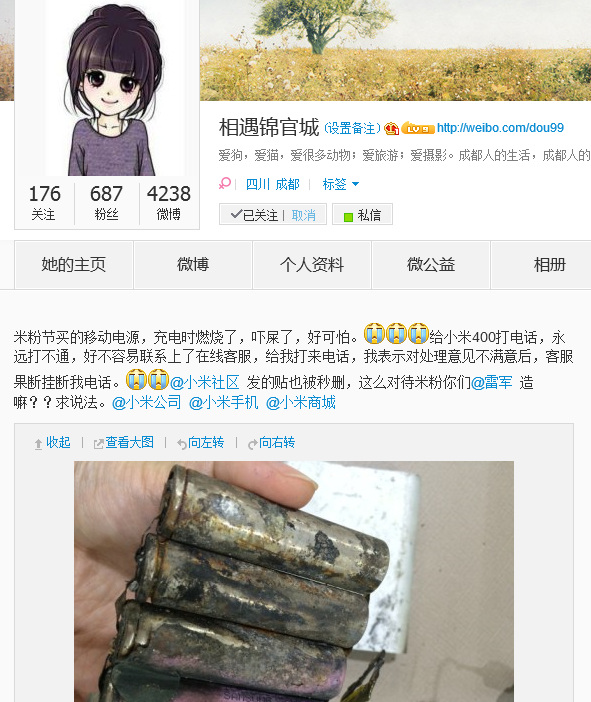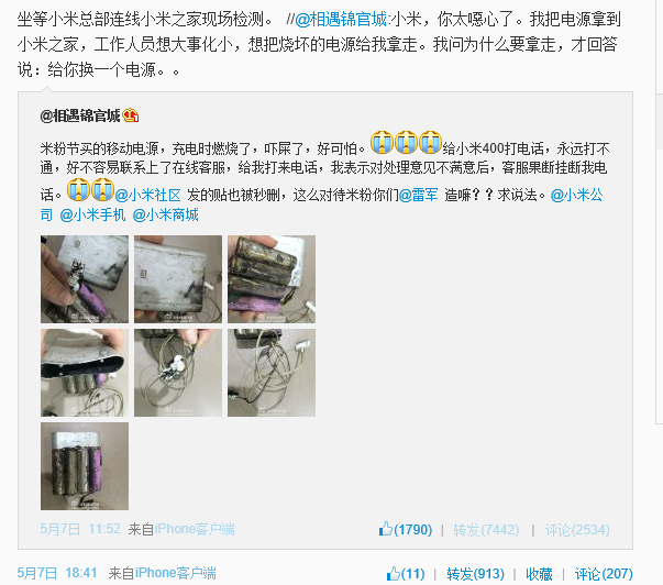 5月7日中午12点左右,一位成都的女性微博网友@相遇锦官城发微博称:米粉节买的移动电源,充电时燃烧了,吓屎了,好可怕。给小米400打电话,永远打不通,好不容易联系上了在线客服,给我打来电话,我表示对处理意见不满意后,客服果断挂断我电话。@小米社区 发的贴也被秒删,这么对待米粉你们@雷军 造嘛??求说法。