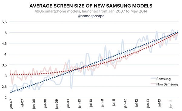 运营商推广可以降低购买成本,对高端智能手机的销售至关重要。以当时的市场环境,三星只要有中规中矩的产品便能成功。而三星不只是中规中矩而已,特别是对消费趋势的把握上,三星2011年推出的Galaxy Note系列引领着手机屏幕越来越大的趋势: