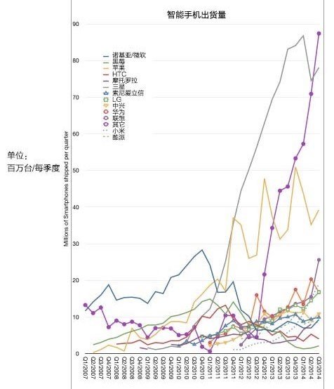 在三星转而下滑的同时,小米、联想、华为等中国手机厂商依然维持着高速增长。特别是小米,它的增长速度就像2010年的三星一样惊人。