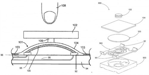 大量解决液态金属合金实际问题的专利也开始出现,上周四又有17份液态金属合金专利公布。当然,很多专利并没有直接提到苹果,不过专利发明人都是一直参与液态金属开发的苹果员工。这些专利中最有趣的一项就是使用液态金属合金材料打造压力传感器,压力传感器经常被用在移动设备的按键和开关下,这种开关必须在频繁使用下保持弹性。这份专利中的示意图显示苹果可能将会使用液态金属合金制作iOS设备Home键下的压力传感器。