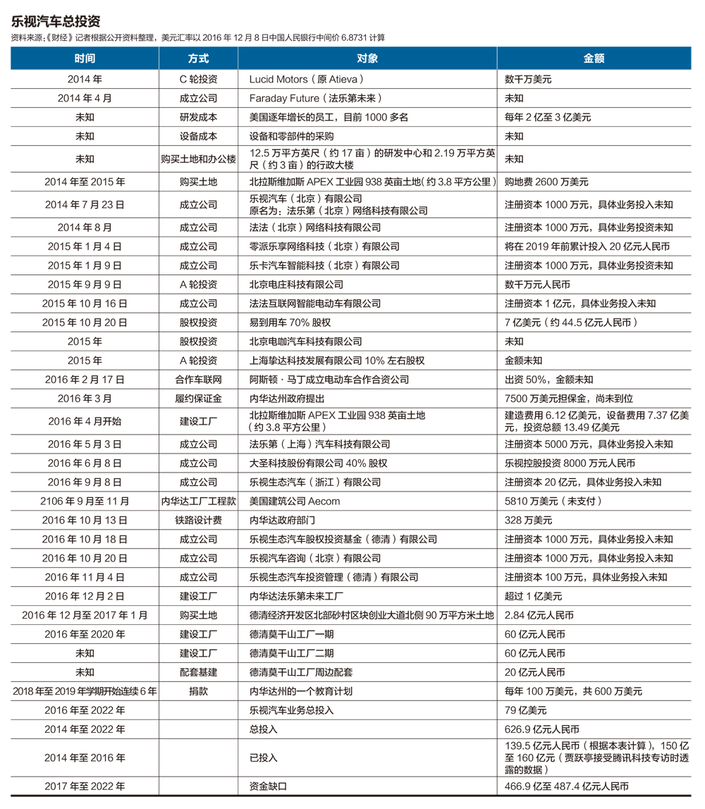 他在专访中透露,乐视汽车业务已投入“一百五六十亿”,而要实现量产,总投入“至少也得400亿到500亿元”。这就是说,乐视还需要投入240亿到350亿元到汽车业务。而按照《财经》记者的统计,资金缺口在460亿元以上(见附表:乐视汽车总投资)。