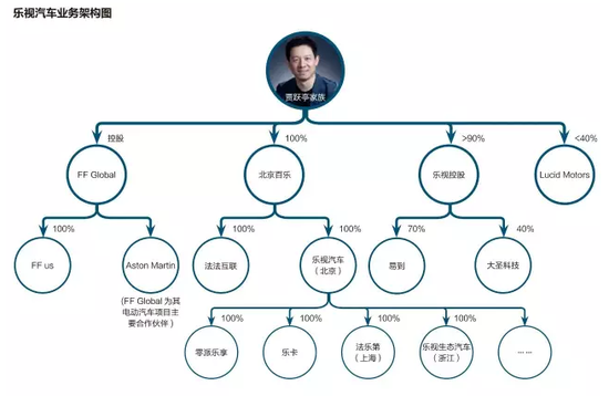《财经》记者通过查询工商资料,初步还原了贾跃亭布局汽车产业链各个公司主体。其中,最醒目的是Faraday Future(法乐第未来,下称“FF”)。这是一家乐视投资10亿美元并绝对控股的电动车初创企业,也是乐视汽车板块的主力部队。