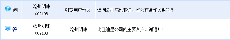 沧州明珠(002108)周二在全景网互动平台上介绍称,比亚迪是公司的主要客户。
