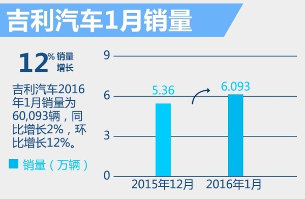 近日,网通社从吉利汽车官方获悉:今年一月,吉利累计销售整车60,093辆,同比增长2%,环比增长12%,终端销量也突破60,000辆。接下来,吉利将进入到新车密集投放期,到今年年底前将至少推出5款全新车型。