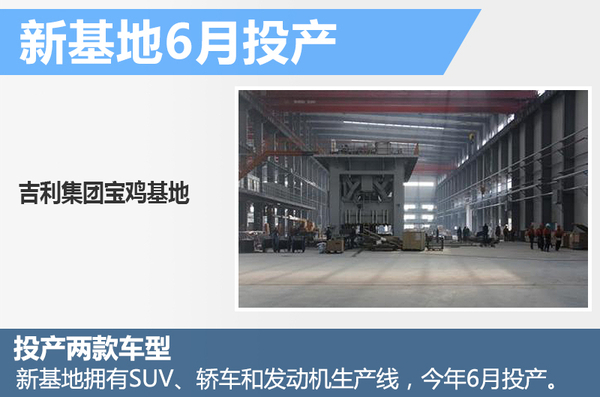 吉利汽车现已在浙江台州、宁波和湖南湘潭、山东济南、四川成都等地建有汽车整车和动力总成制造基地,今年吉利集团宝鸡基地也将正式投产,将建成SUV、轿车和发动机生产线,吉利全新SUV车型博越则在该工厂投产。按照规划,宝鸡基地生产线将在今年3月份调试完成,在6月实现首台车下线。除此之外,吉利与沃尔沃共同研发的1.5T发动机项目也即将在宝鸡开工建设,规划年产能为36万台,建设周期30个月。
