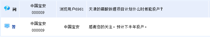 中国宝安(000009)周四晚间在全景网互动平台上回答投资者提问时透露,天津的磷酸铁锂项目预计下半年投产。
