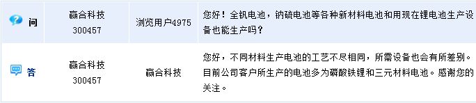 赢合科技(300457)周二在全景网互动平台上表示,不同材料生产电池的工艺不尽相同,所需设备也会有所差别。目前公司客户所生产的电池多为磷酸铁锂和三元材料电池。