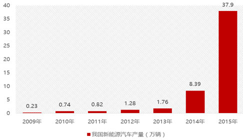 2009年以来,我国新能源汽车的产量连年上升,带动了动力电池行业的飞速发展。据工信部数据显示,2015年我国生产新能源汽车37.90万辆,同比增长4倍。其中纯电动乘用车生产29.07万辆,插电式混合动力乘用车生产8.82万辆,较2014年增长均超过3倍。