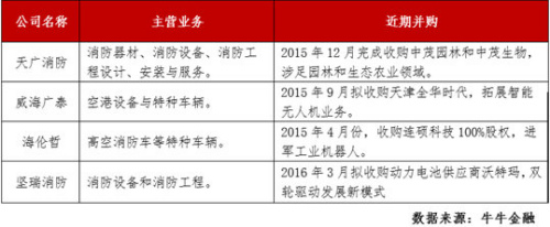 2015年12月,天广消防完成了对中茂园林和中茂生物的收购,公司进入园林和生物制品领域,形成了三主业驱动的发展模式。海伦哲则是在拥有消防车辆、特种车辆的基础上,收购工业机器人企业连硕科技,目前公司消防车辆、特种车辆、LED照明、工业机器人等多领域发展,协同效应明显。而威海广泰自 2009 年以来,先后收购北京中卓时代、营口新山鹰、天津全华时代(收购正在实施),形成了“以空港设备为基础业务,以消防设备为发展业务,以无人机和军品为新兴业务”的战略布局。