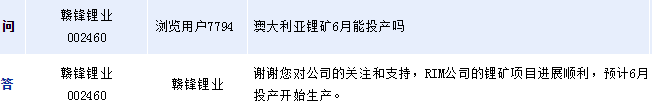 赣锋锂业(002460)周四在全景网互动平台上表示,RIM公司的锂矿项目进展顺利,预计6月开始投入生产。
