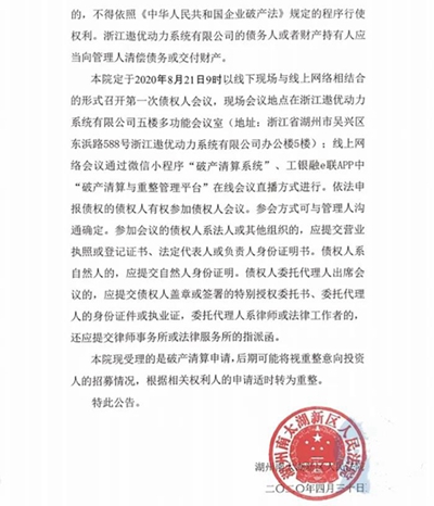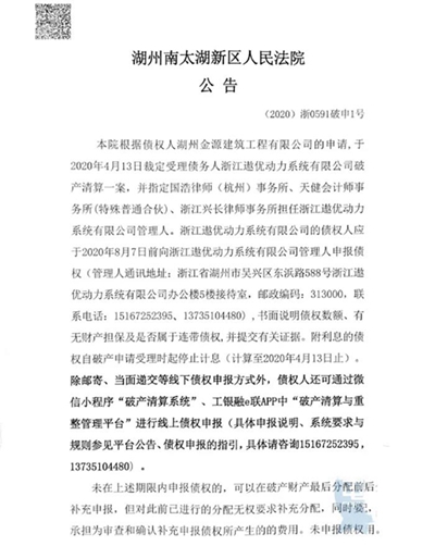 随后,遨优动力的状况急转直下。法院公告称,根据债权人湖州金源建筑工程有限公司的申请,于2020年4月13日受理债务人遨优动力破产清算一案,相关债权人应于2020年8月7日前向遨优动力管理人申报债权。法院公告还显示,法院受理的是破产清算申请,后期可能将视重整意向投资人的情况,根据相关权利人的申请适时转为重整。