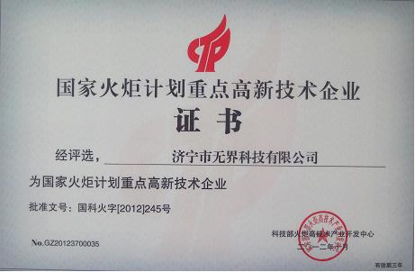 近日,山东济宁无界科技有限公司收到国家科技部颁发的“国家火炬计划重点高新技术企业”证书。据悉,2012年全国共评选出784家国家火炬计划重点高新技术企业,山东省济宁国家高新区获得