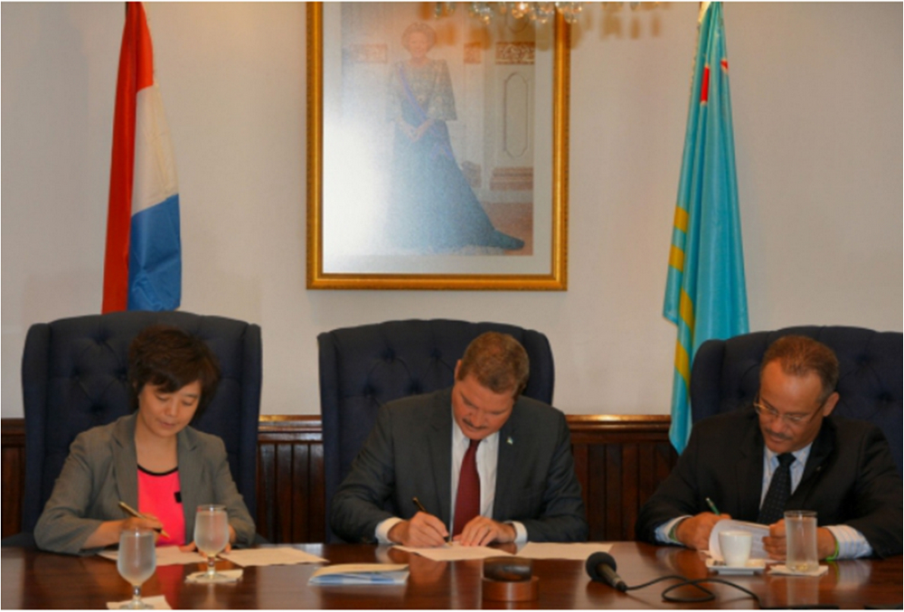 11日,阿鲁巴总理迈克·埃曼,财政部部长迈克·梅萨,阿鲁巴Utilities Aruba NV运营总监弗兰克·赫沃兹与比亚迪美国分公司总裁李柯签订合作谅解备忘录。阿鲁巴计划运用比亚迪的绿色科技在2020年前实现成为“零排放”国家的雄伟目标。
