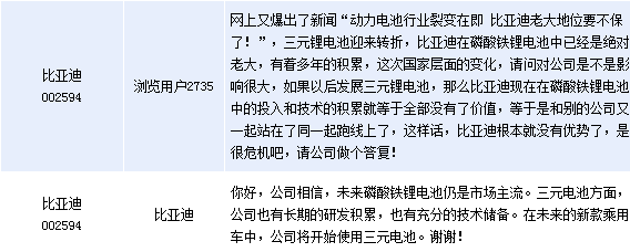 比亚迪(002594)周三在全景网互动平台上表示,未来磷酸铁锂电池仍是市场主流。三元电池方面,公司也有长期的研发积累,也有充分的技术储备。在未来的新款乘用车中,公司将开始使用三元电池。