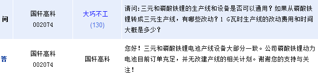 国轩高科周一在全景网互动平台上表示,公司磷酸铁锂动力电池目前订单充足,并无改建产线的相关计划。