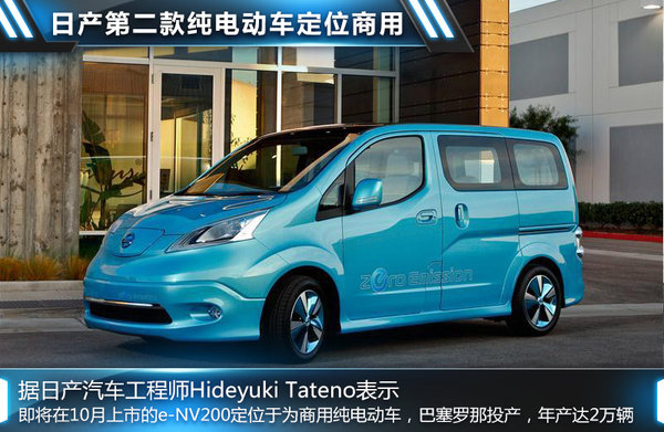 日产汽车对新能源解决方案的研发包括混合动力、燃料电池以及对传统内燃发动机燃油经济性的改造。但是未来纯电动车将是其新能源战略的首选,包括即将推出的e-NV200在内,目前日产总共推出了两款纯电动车。日产聆风为五门五座掀背轿车,市场定位于家用轿车,其在完全充电情况下可实现160公里以上的巡航里程,而即将在10月上市的e-NV200定位于为商用纯电动车。据日产汽车工程师Hideyuki Tateno介绍,e-NV200将在日产西班牙的巴塞罗那工厂进行投产,年产量可达2万辆以上。