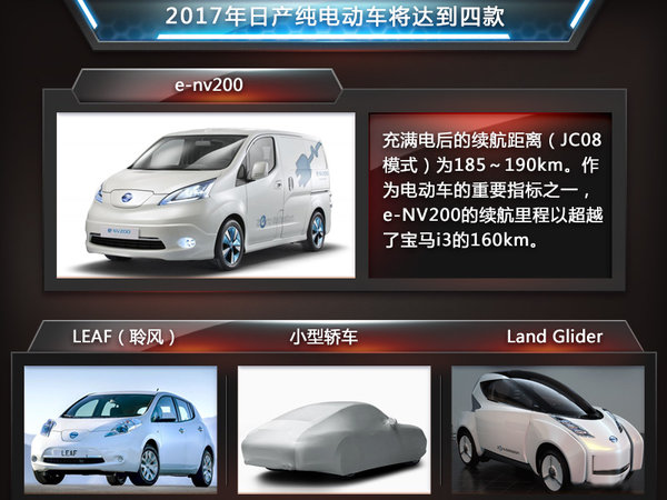 日产汽车在积极推动EV(纯电动汽车)战略,除聆风和e-nv200外,日产在2017年3月之前还将推出两款纯电动车。关于这四款纯电动汽车,日产汽车技术营销室铃木伸典室长在接受媒体访问时表示:在LEAF(聆风)以外,我们还规划了3款电动车产品,都是在聆风这个全新平台上开发的。其中一款是LCV(轻型商用车),一个是小型轿车,还有就是外形类似摩托的概念车Land Glider。另外,网通社从美国汽车新闻获悉:日产汽车计划2017年推出下一代聆风纯电动车,从电池组和外观设计等角度改进新车,使续航里程比当前的聆风增加一倍以上,达到300Km左右。