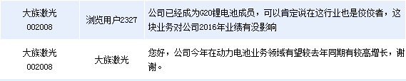 大族激光(002008)周三在全景网互动平台上表示,公司今年在动力电池业务领域有望较去年同期有较高增长。
