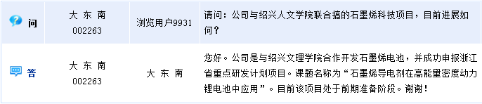 大东南(002263)周四在全景网互动平台上透露,公司与绍兴文理学院合作开发石墨烯电池,并成功申报浙江省重点研发计划项目,课题名称为“石墨烯导电剂在高能量密度动力锂电池中应用”。