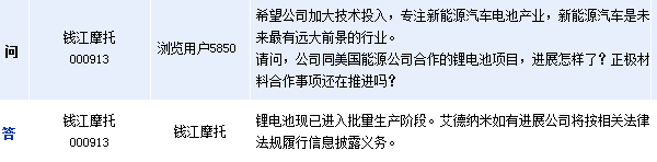 钱江摩托(000913)周五在全景网互动平台上表示,公司锂电池现已进入批量生产阶段。