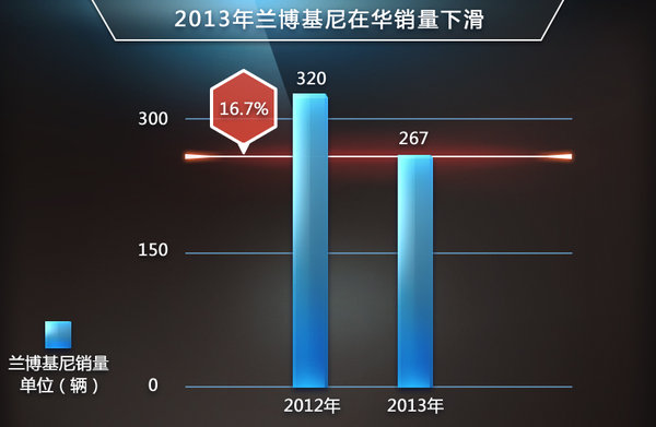 美国和中国仍然是兰博基尼第一和第二大单一市场。2013年兰博基尼在全球范围交付了2,121辆汽车,相比2012年的2,083辆,同比增长1.8%。去年全世界超豪华品牌超跑市场转冷,兰博基尼的增长超过了整体市场表现。该品牌全年在美国累计销量从520辆同比增长6%至552辆。不过兰博基尼在中国表现则较为逊色。2013年全年在华销量为267辆,较之2012年的320辆,同比滑坡16.7%。