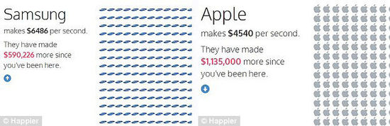 排名榜首的三星公司每秒赚进6486美元(约合人民币3.95万元),而苹果公司则凭借每秒赚进4539美元(约合人民币2.77万元)屈居第二,黑莓每秒只有205美元(约合人民币0.12万元)的入账,排名倒数第一。